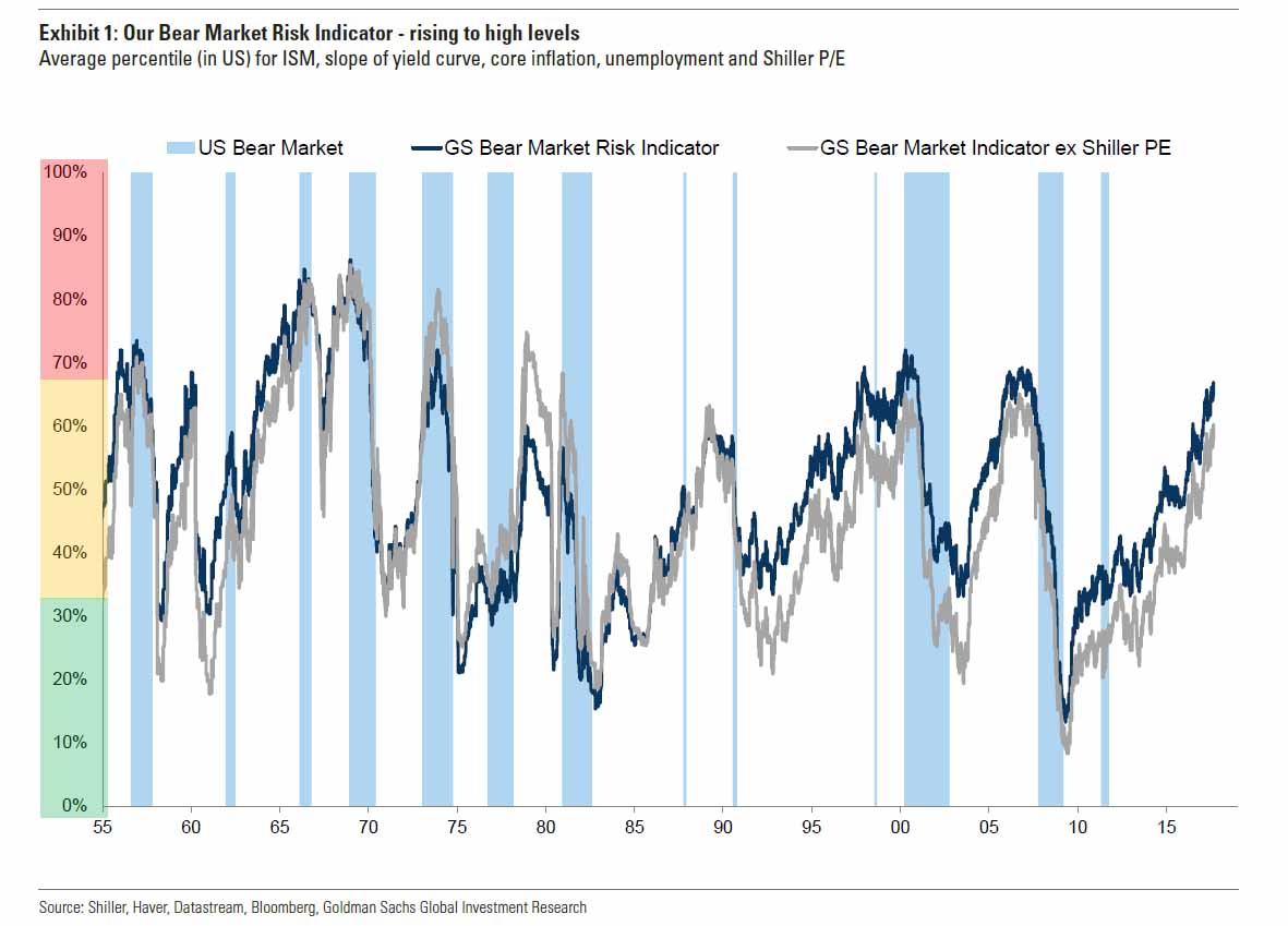 The blue bars are recessions, or bear markets. The graphic lines are leading market indicators. No one knows when they will turn downward, nor the speed of the downward trajectory (usually very quick). And it’s too hard to tell if it’s a permanent shift down, or just another tweak before reaching new heights.