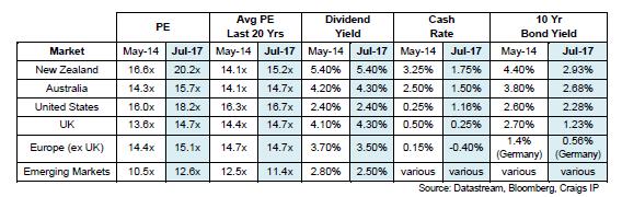 So, are markets over-valued? The ones that appear this way are bond markets (fixed interest) and residential property (if we are talking NZ). The NZ share market looks as highly valued as any in the western world (not as high as our real estate). I saw someone quote in the media recently the old: “return of capital is more important than the return on capital”. Hey I agree, but over what time frame?